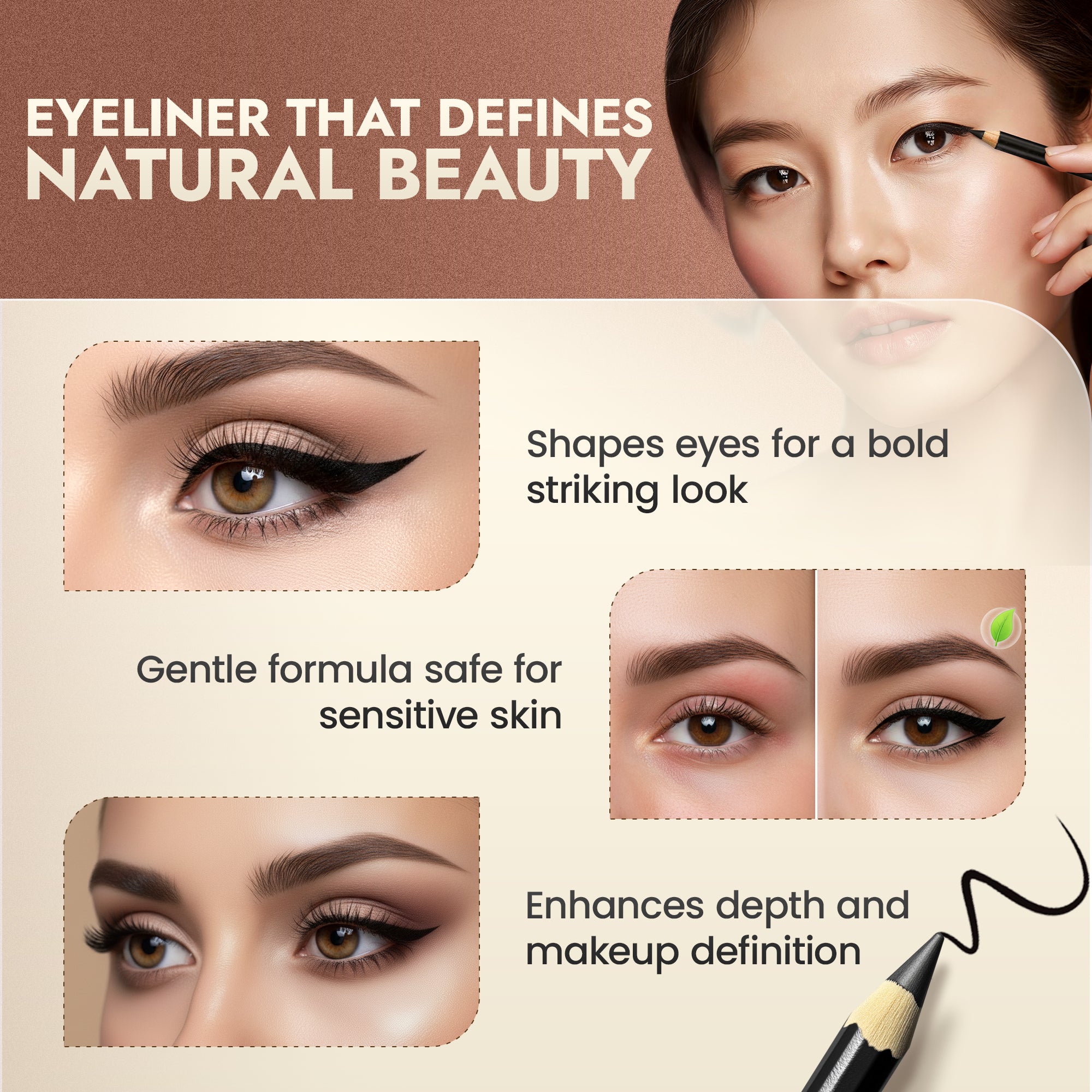 Choose black for instant, fierce impact, or reach for brown when you want that soft, natural enhancement. Either way, the creamy wooden pencil glides like silk, hugs your lash line without tugging, and delivers the rich color payoff you crave—no irritation, no compromise.